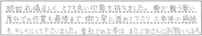 終始礼儀正しくとても良い印象を持ちました。雪が舞う寒い屋外での作業も最後までご丁寧に進めて下さり、工事後の掃除もキレイにして下さいました。貴社での工事はまた上田さんにお願いします。