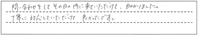 問い合わせをしてその日の内に来て頂けて助かりました。丁寧に対応して頂けて良かったです。