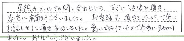 突然のメールでの問い合わせにもすぐに返信を頂き、本当に有難うございました。お電話も頂きましたが、丁寧にお話しをして頂き安心しました。急いでおりましたので、本当に助かりました。ありがとうございました。