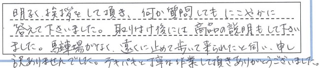 明るく挨拶をして頂き、何か質問してもにこやかに答えて下さいました。取り付け後には、商品の説明もして下さいました。駐車場がなく、遠くに止めて歩いて来られたと伺い、申し訳ありませんでした。テキパキと丁寧な作業して頂きありがとうございました。