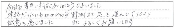 今回も素早い対応ありがとうございました。凍結だったにもかかわらず野洲まで足を運んでくださり誠意を感じました。またよろしくお願いします。