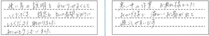 寒い中の作業お疲れ様でした。おかげさまで温かいお湯が出て過ごしやすいです。