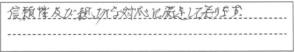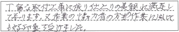 丁寧な取付工事に俊り、仕上がりの美観に満足しております。又作業の協力者の方の作業に関しても好印象を受けました。