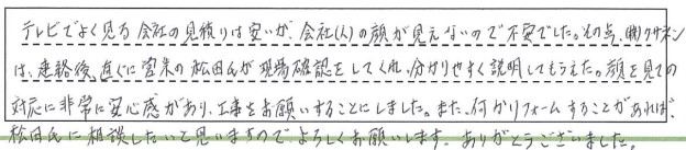 テレビでよく見る会社の見積もりは安いが、会社(人)の顔見えないので不安でした。その点、(株)クサネンは、連絡後直ぐに営業の松田氏が現場確認をしてくれ、分かりやすく説明してもらえた。顔を見ての対応に非常に安心感があり、工事をお願いすることにしました。また、何かリフォームすることがあれば、松田氏に相談したいと思いますので、よろしくお願いします。ありがとうございました。