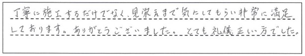 丁寧に施工するだけでなく、見栄えまで気にしてもらい非常に満足しております。ありがとうございました。とても礼儀正しい方でした。
