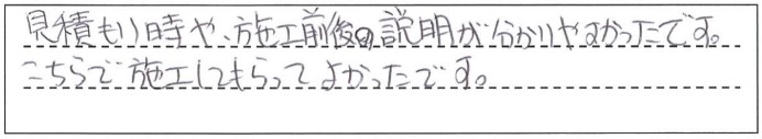 見積もり時や、施工前後の説明がわかりやすかったです。こちらで施工してもらってよかったです。