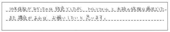 10年保証がなかったのは残念でしたが、トイレリフォームと水栓の修理は満足でした。また機会があればお願いしたいと思います