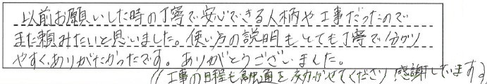 以前お願いした時の丁寧で安心できる人柄や工事だったので、また頼みたいと思いました。使い方の説明もとても丁寧で分かりやすく、ありがたかったです。ありがとうございました。(工事の日程も融通をきかせてくださり感謝しています。)