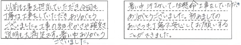 以前も工事を担当していただき、今回も丁寧な工事をしていただきありがとうございました。工事の細やかさや確実さ、説明も大満足です。暑い中ありがとうございました。