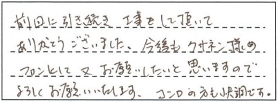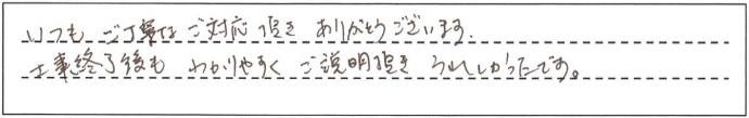 いつもご丁寧なご対応頂き、ありがとうございます。工事終了後も分かり易くご説明頂きうれしかったです。