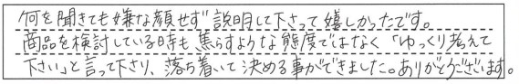 何を聞いても嫌な顔せず説明して下さって嬉しかったです。商品を検討している時も焦らすような態度ではなく「ゆっくり考えて下さい」と言って下さり、落ち着いて決めることが出来ました。ありがとうございます。