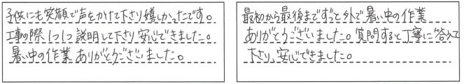 子供にも笑顔で声をかけて下さり嬉しかったです。工事の際1つ1つ説明して下さり安心できました。暑い中の作業ありがとうございました。