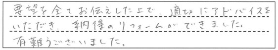 要望を全てお伝えした上で、適切にアドバイスをいただき、納得のリフォームができました。