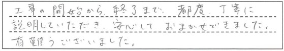 工事の開始から終了まで、都度 丁寧に説明していただき、安心しておまかせできました。