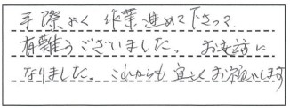 手際よく作業進めて下さって有難うございました。お世話になりました。これからも宜しくお願いします。