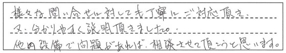 様々な問い合せに対しても丁寧にご対応頂き、又、分かりやすく説明頂きました。他の設備で問題があれば、相談させて頂こうと思います。