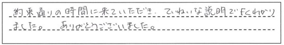 約束通りの時間に来ていただき、ていねいな説明でよくわかりました。ありがとうございました。