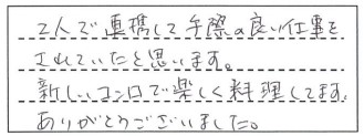 2人で連携して手際の良い仕事をされていたと思います。新しいコンロで楽しく料理してます。ありがとうございました。