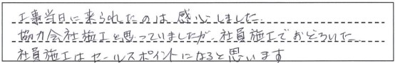 工事当日に来られたのは感心しました。協力会社施工と思っていましたが、社員施工でおどろいた。