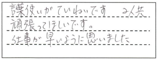 言葉使いがていねいです。2人共頑張ってほしいです。仕事が早いように思いました。