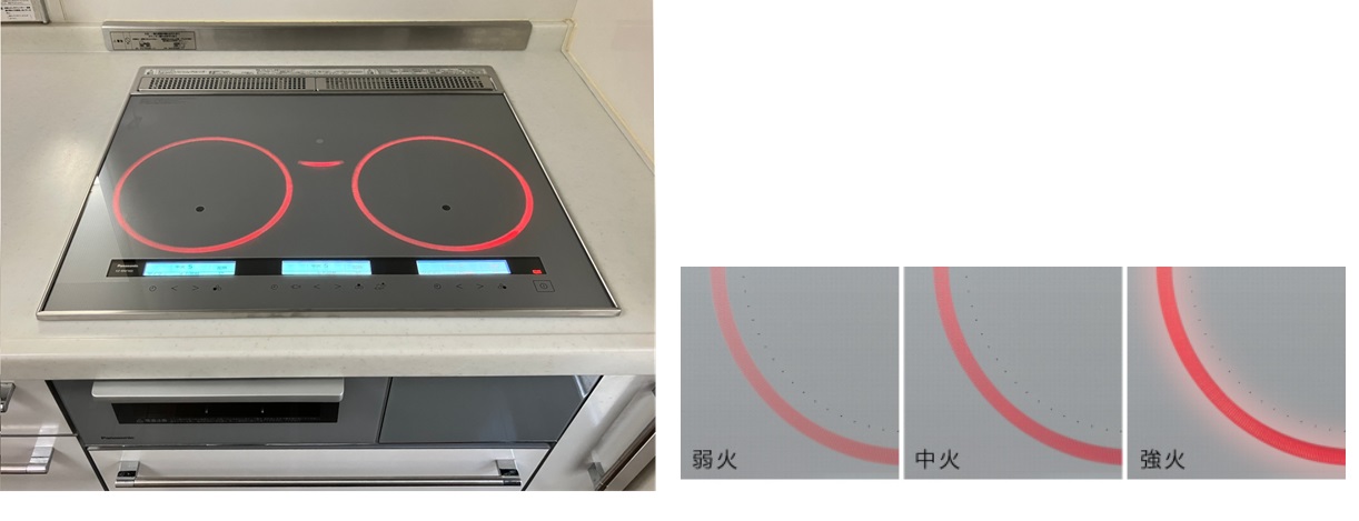 火力に応じて明るさが10段階に変化する「光るリング」。鍋を置く場所や火力の強さが一目で分かるので、初めてIHを使う方にも分かりやすい仕様になっています。