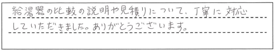 給湯器の比較の説明や見積りについて、丁寧に対応していただきました。ありがとうございました。