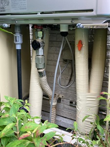 新しく設置した給湯器の配管の様子です。配管カバーに隠れているのでお客様が目にすることは通常は無いと思います。クサネン基準で保温はもちろん、きっちりと施工しています。