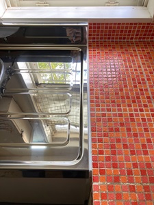 残った既存キッチンとの境目です。高さの調整など細かい加工はできないため数ミリの段差が出ることは予め了承いただいています。