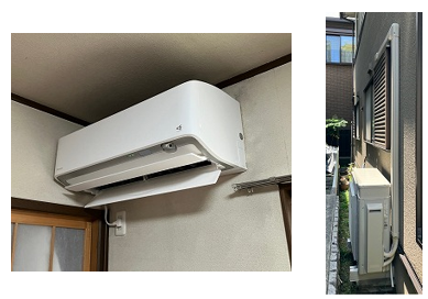 『うるさら』への交換では、室外機は通常タイプの上に加湿器が乗っている状態のため、約20cmほど高くなり、配管は、通常の配管+加湿ホースが必要になりますので、通常よりも太めのダクトを使用します。