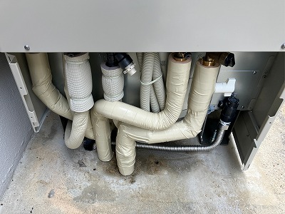 配管カバー内の配管の様子です。冬場の凍結防止用の保温筒もしっかりと巻いております。
