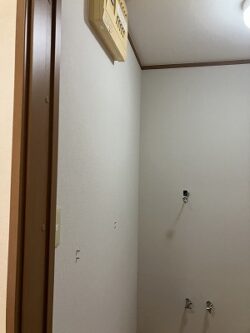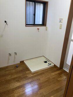 まずは内装工事からおこないます。既設洗面台の撤去、洗濯機も移動して全面壁クロスを貼替えます。