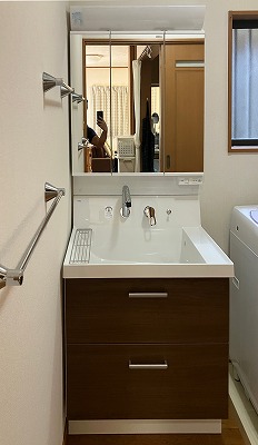 2年ほど前にガス給湯器の交換をさせていただいたお客様、今回、洗面化粧台とクロスの貼替えで再びご相談いただきました。