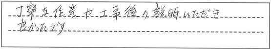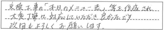 交換工事の「本日のメニュー表」等を作成され、大変丁寧に対応していただき良かったです。次回もよろしくお願いします。