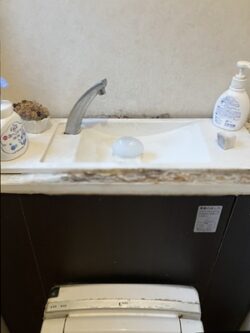 背面にキャビネットがあるタイプのトイレをお使いでしたが、手洗い時の水ハネが原因で周辺の化粧板がはがれ、かなり劣化した状態でした。