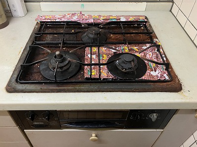 ご使用年数27年。現在1口点火不良で、錆びや穴が開いているところがあり、かなり傷んでしまっている状態。