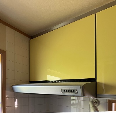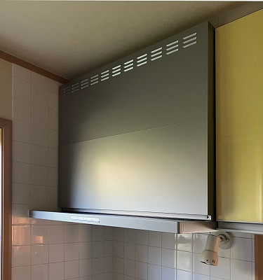 新しいレンジフードをキッチン棚に合せて設置すると、タイルが貼られていない箇所が見えてしまうため、お客様とご相談し、少し前に出して設置しております。