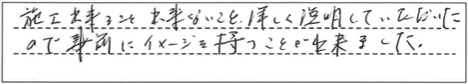 施工出来ること、出来ないことを詳しく説明していただいたので事前にイメージを持つことが出来ました。