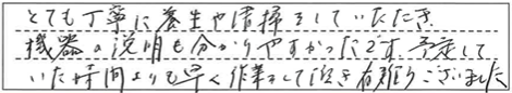 とても丁寧に養生や清掃をしていただき機器の説明も分かりやかったです。予定していた時間よりも早く作業して頂き有難うございました。