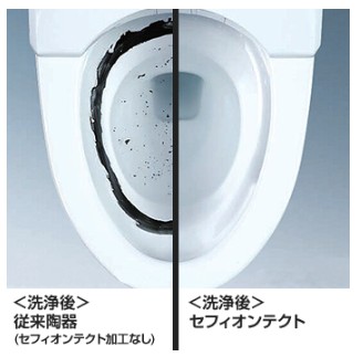 TOTO製の独自の技術で陶器表面をナノレベルでなめらかに仕上げ(セフィオンテクト)、汚れが付きにくく、ツルっと落ちやくなっています。