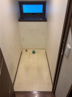 既設のトイレ、収納部分、手洗い器を全て撤去し、内装の貼替え工事をおこないます。
