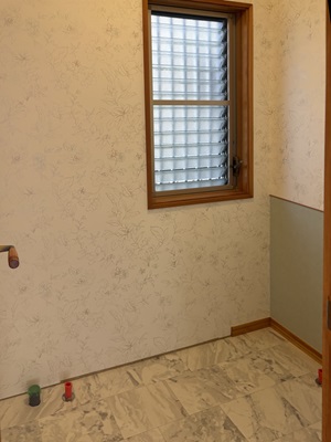内装は、上部にやわらかな花柄クロス、下部に淡いグリーングレーのクロスを貼り分け、床には明るい大理石調のクッションフロアを採用。