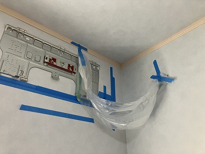 壁にはエアコンの室内機を壁に固定するための据付板を設置します。
