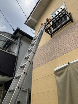 外では、梯子を使用して1階に設置する室外機まで配管を繋ぎます。安全第一にベテランのスタッフが対応。