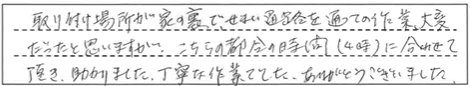 取り付け場所が家の裏でせまい通路を通り抜けての作業、大変だったと思いますが、こちらの都合の時間(4時)に合わせて頂き、助かりました。丁寧な作業でした。ありがとうございました。