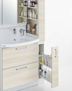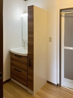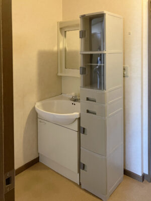 交換前は、幅60㎝の洗面台の横に市販のトールキャビネットを設置されていました。