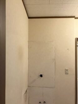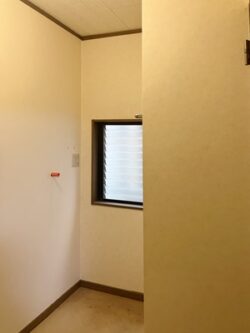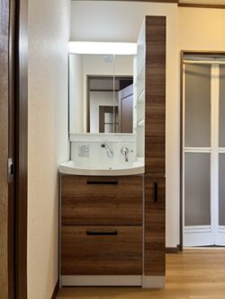 草津市のお客様のお宅にて洗面化粧台の交換と洗面所の内装貼り替えを行いました。