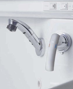 希望されていたハイバックの壁付け水栓は根元に汚れがたまりにくくお手入れが簡単。