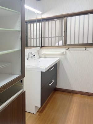草津市のお客様のお宅にて洗面化粧台の交換を行いました。