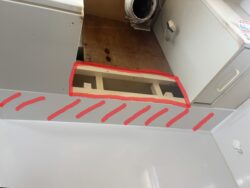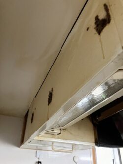 現地調査にお伺いすると、既存レンジフード(換気扇)の背面下部20cmほどに壁がない部分がありました。