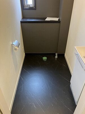 クッションフロアも併せて交換しました。背面のダークトーンに合せて床材も黒ベースで統一し、空間が一気にモダンな雰囲気になりました。